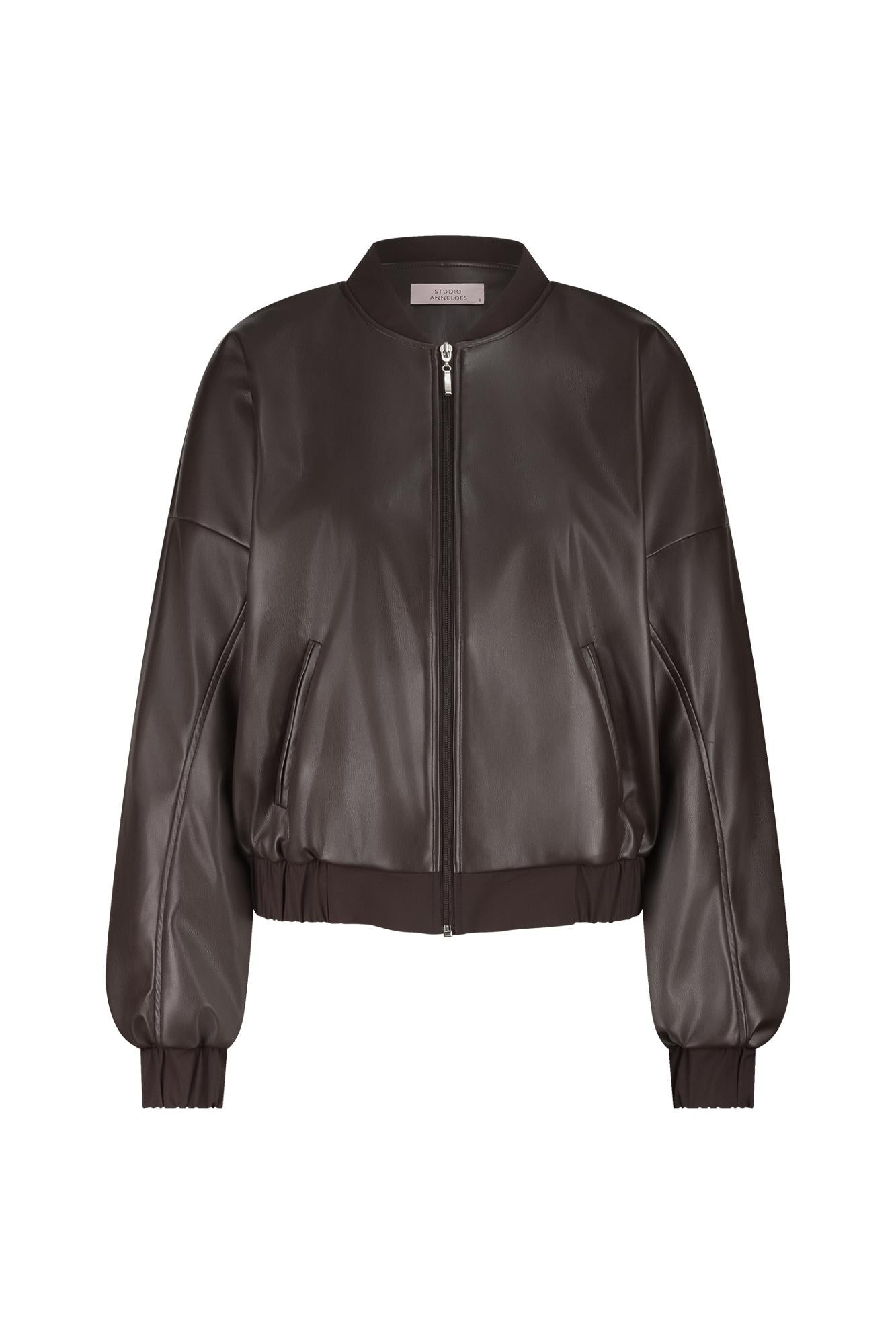 Maak kennis met de Mayte faux leather bomber van Studio Anneloes, de stijlvolle donkerbruine jas die elke outfit een moderne twist geeft. Met een praktische ritssluiting en elastische boorden biedt dit kledingstuk een comfortabele pasvorm en een verfijnde look. Perfect voor casual dagen en avondjes uit.