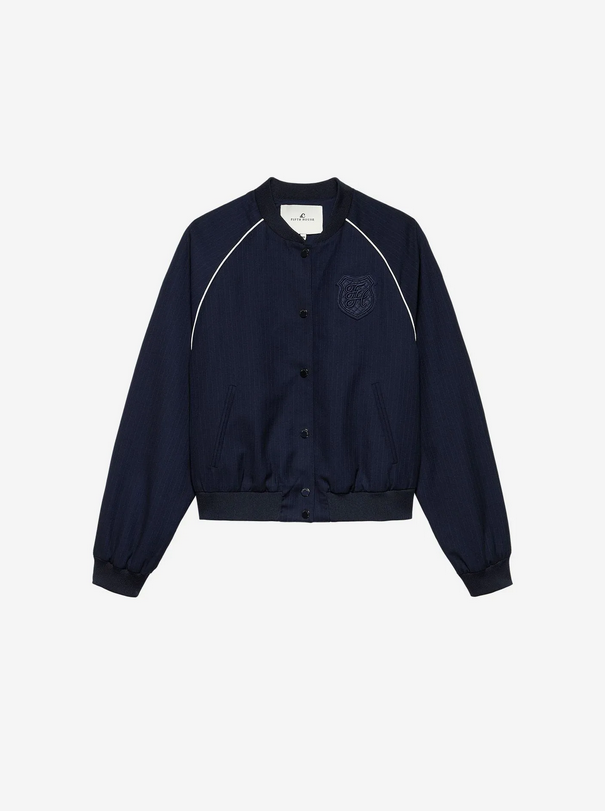 Lory Jacket van Fifth House is een sportief jasje in wit met fijne verticale strepen. Het kledingstuk heeft een drukknoopsluiting, geribde kraag, manchetten en zoom, plus twee schuine zakken met donkere bies. Op de borst staat een zwarte schildpatch die direct opvalt. Als jasje oogt het licht en casual; draag je het makkelijk over een top.
