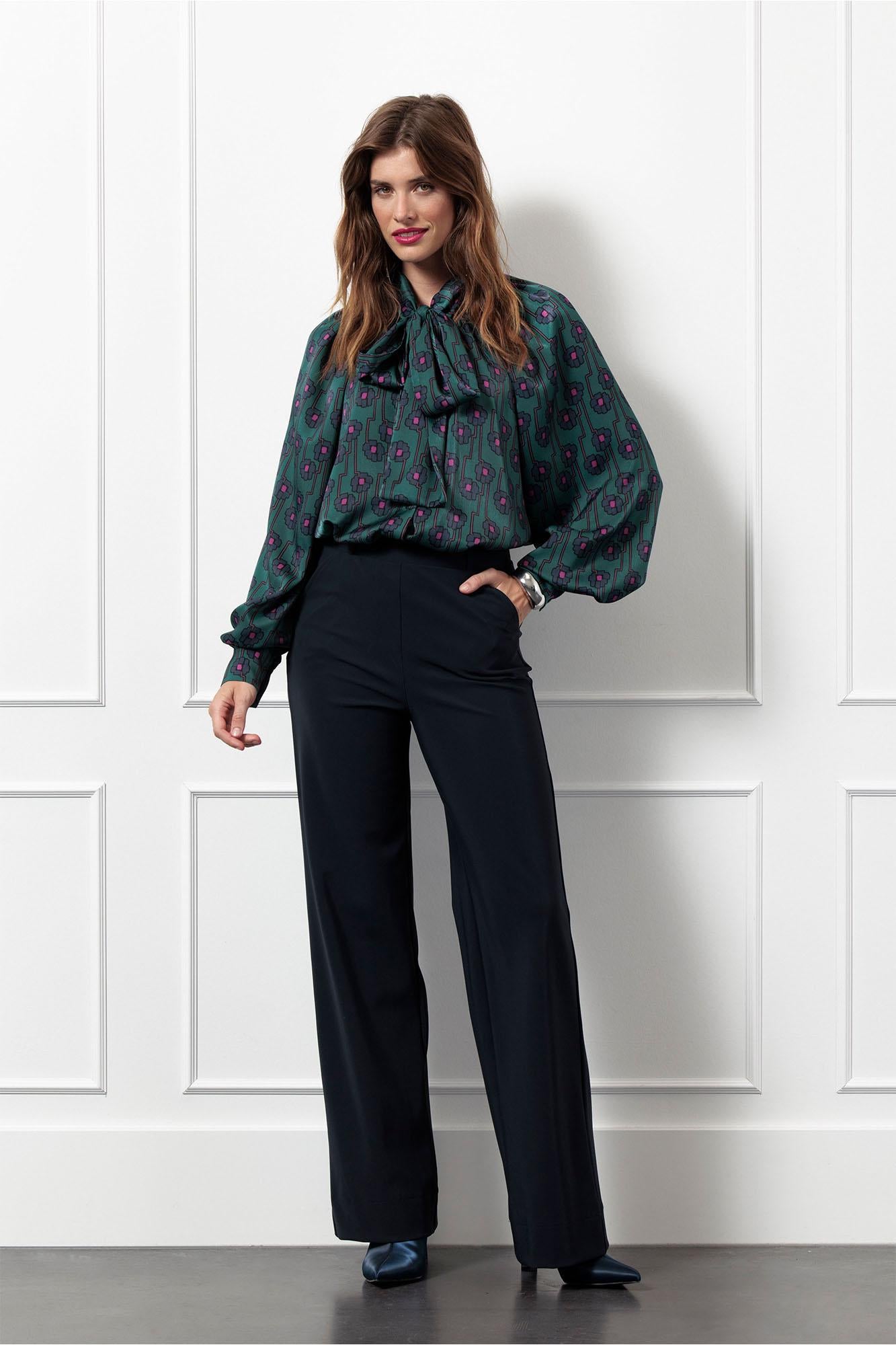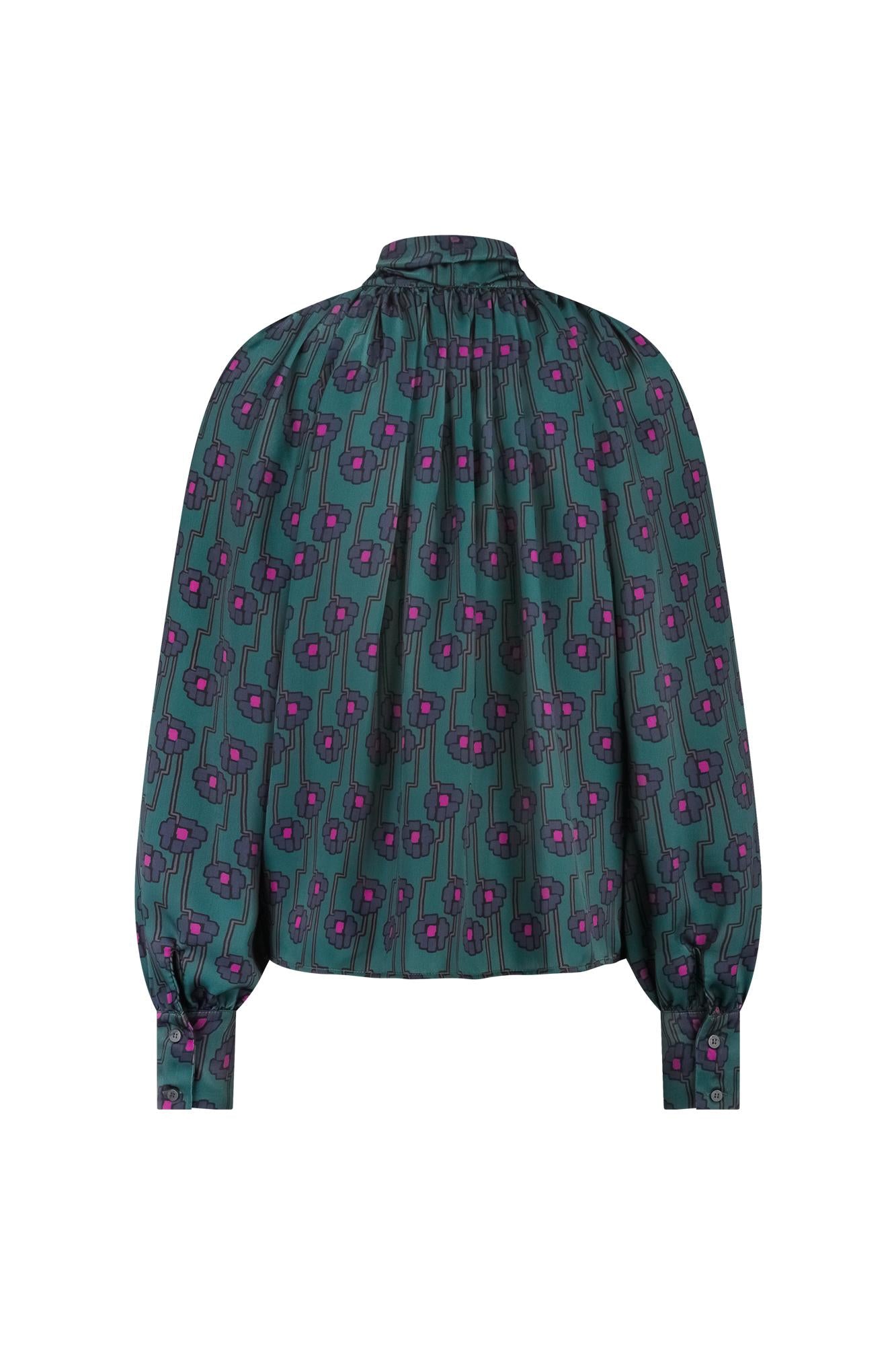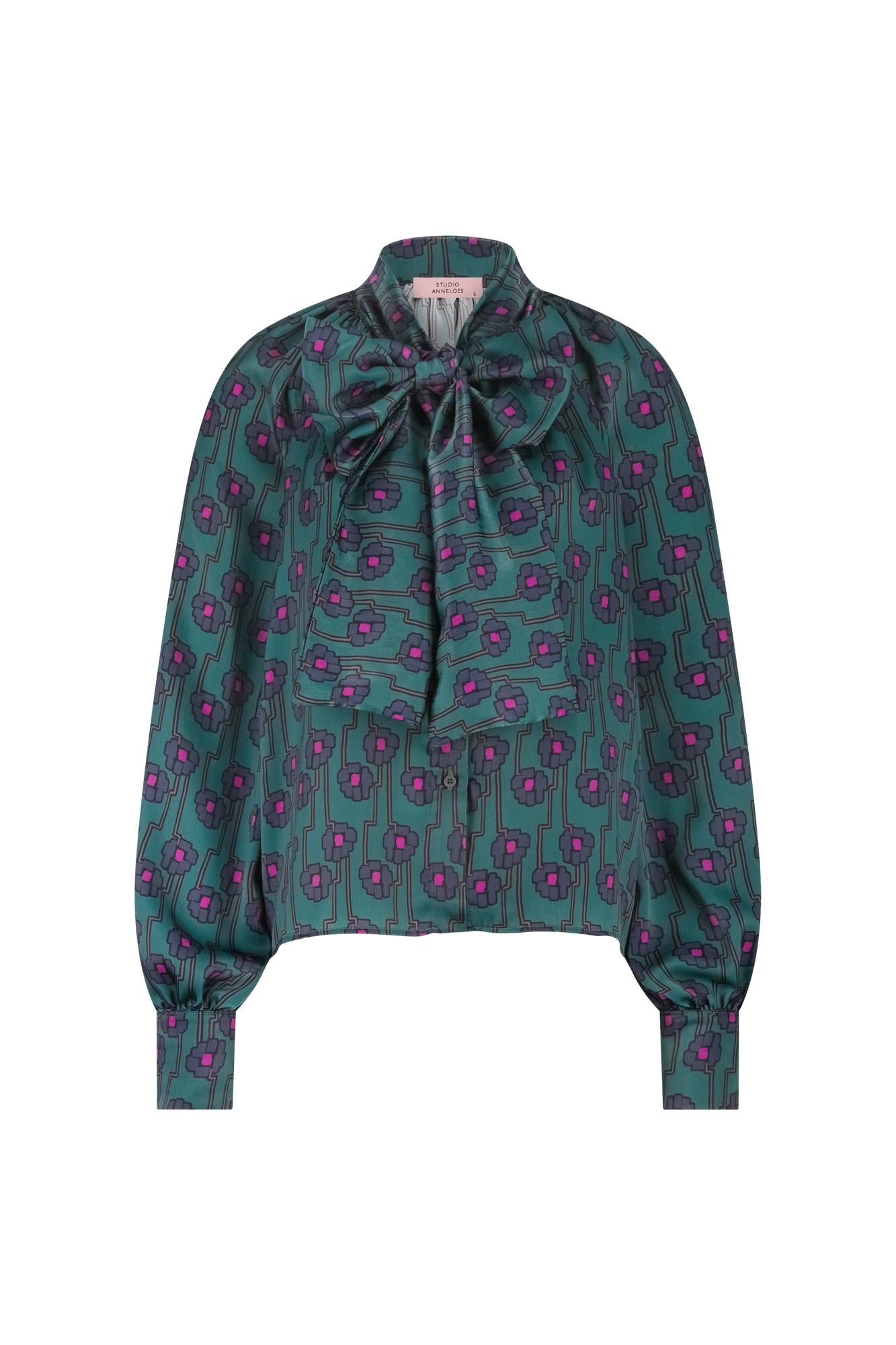 Kimora square flower blouse van Studio Anneloes. Deze losvallende blouse in petrolgroen heeft een square flower dessin met paarse accenten. De hals is afgewerkt met een grote strik, de mouwen zijn licht ballonvormig met manchetten. Het kledingstuk heeft een knoopsluiting voor en een rechte zoom.