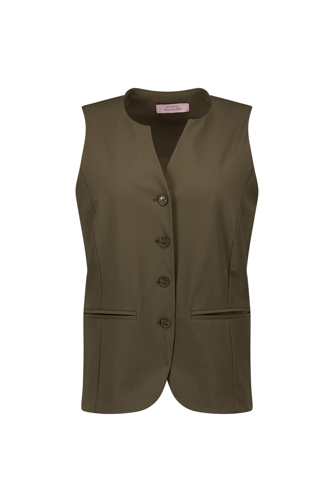 Lenora gilet van Studio Anneloes, een mouwloze blazer in effen olijfgroen. Zoals je ziet: recht vallend silhouet, ronde halslijn zonder revers, vier knopen en twee paspelzakken. Effen; geen logoprint. Soort product: Blazer.