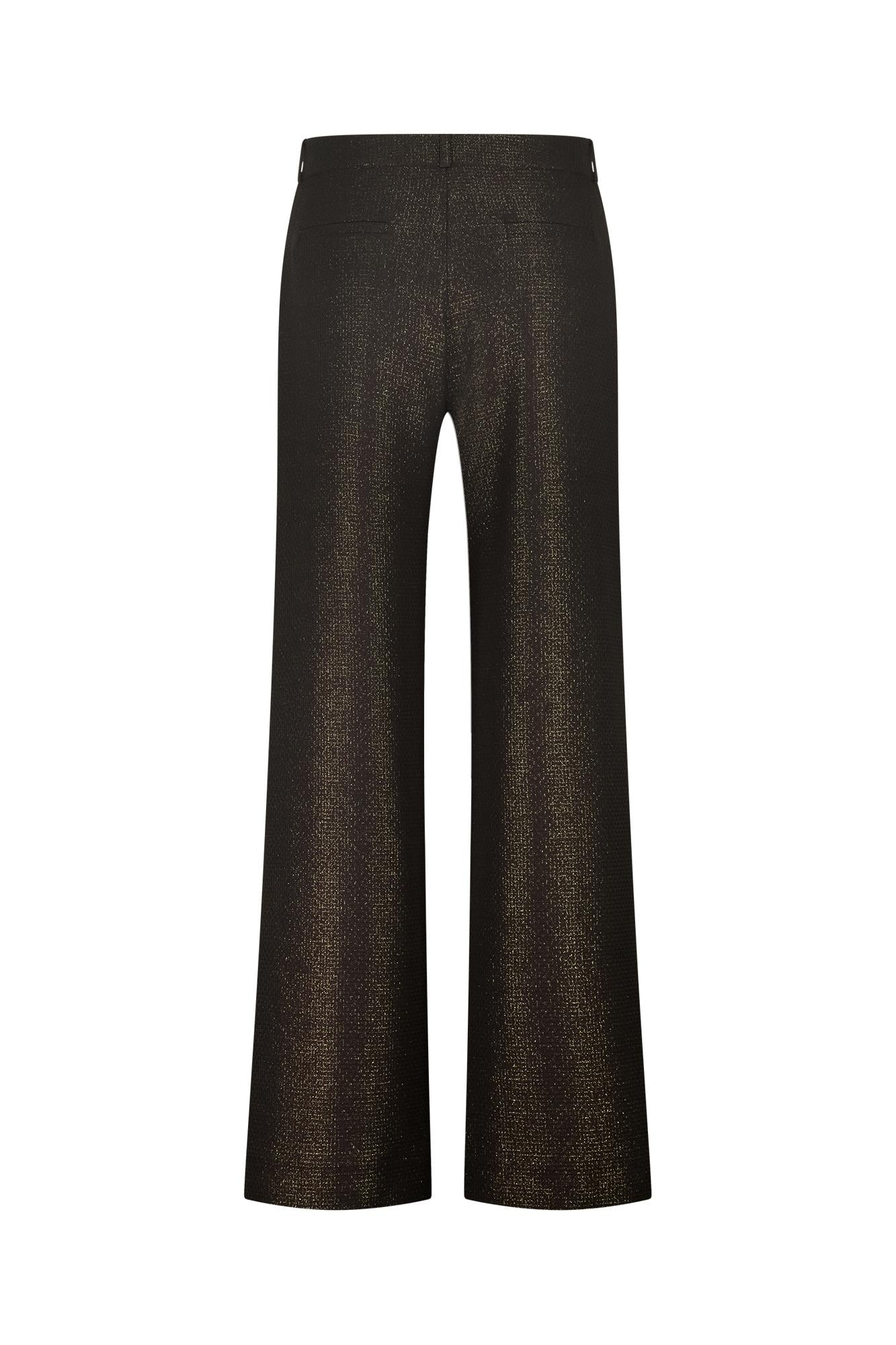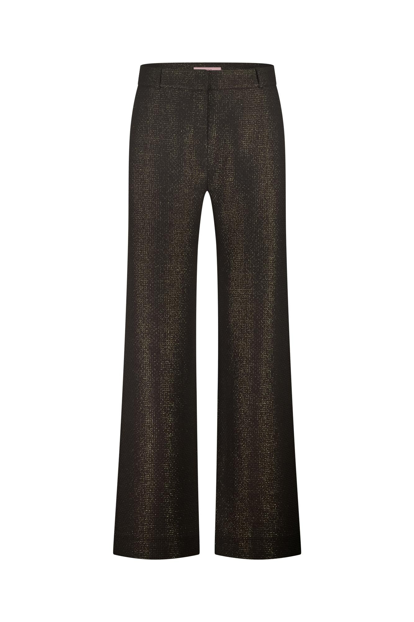 Lexie sparkle waffle trousers van Studio Anneloes is een broek met rechte, lichtwijde pijpen. De kleur is zwart met subtiele goudkleurige sparkle over het hele oppervlak voor een chic dessin. Het kledingstuk heeft riemlussen en een nette tailleband; de pijpen vallen mooi recht.