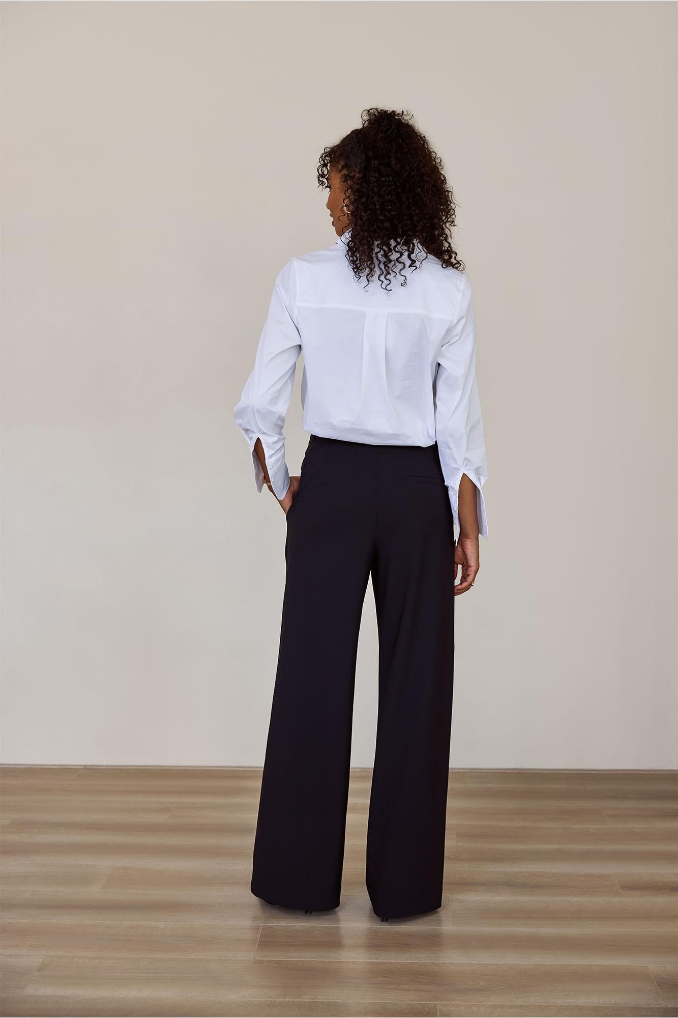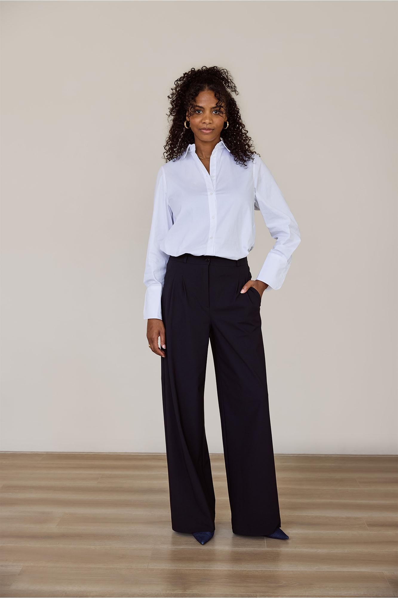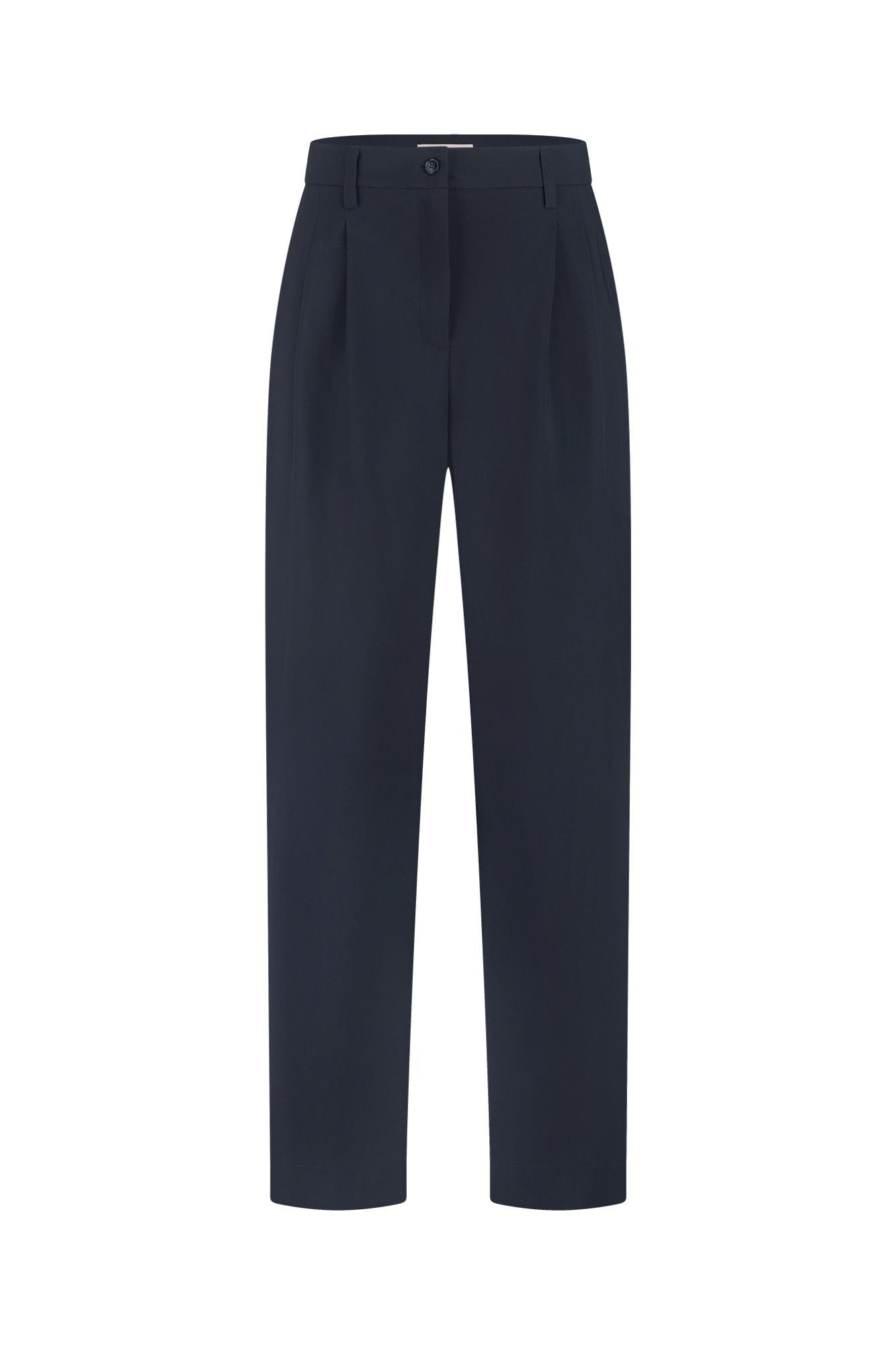 Scout trousers van Studio Anneloes is een donkerblauwe broek met een rechte, licht toelopende pasvorm. Het kledingstuk heeft een nette tailleband met knoop, gulp en riemlussen. Voorplooien zorgen voor ruimte en een mooie valling. Het effen design oogt rustig en modern; ideaal als basis.