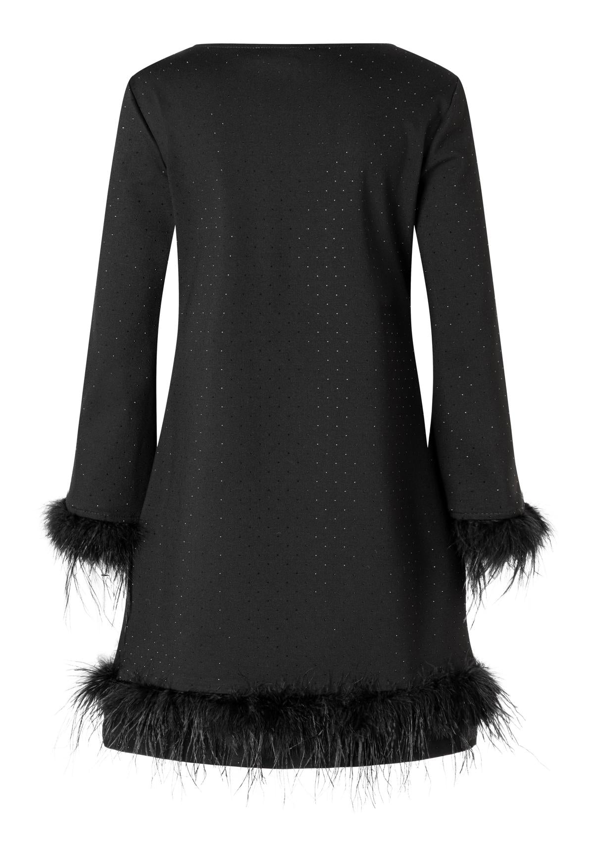 Die "Kleid Federn Schwarz" ist ein charmantes Kleid, das Eleganz mit einem Hauch von Luxus verbindet. In tiefem Schwarz gehalten, besticht es durch funkelnde Details und zarte Federn am Saum und den Ärmeln. Die figurschmeichelnde Passform unterstreicht Ihre Silhouette und macht es zu einem einzigartigen Blickfang.