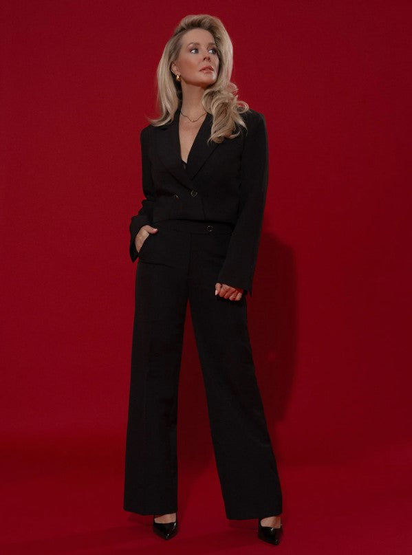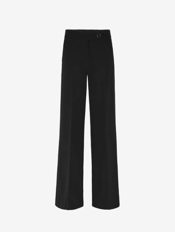 Kenzy Pants von Fifth House: eine elegante, unifarbene Hose in Schwarz mit weitem, gerade fallendem Bein. Der Sitz ist locker und komfortabel, die Silhouette lang und clean. Details: seitliche Taschen und Frontverschluss mit Knopf. Keine Prints, nur klare Linien – ideal, wenn du es schlicht magst. Name: Kenzy Pants. Produktart: Hose.
