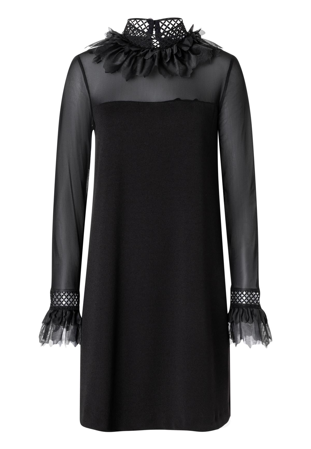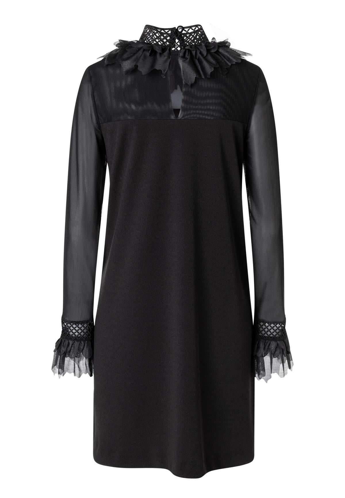 Dieses elegante schwarze Kleid von Ana Alcazar kombiniert Stil mit Raffinesse. Mit transparenten Ärmeln und einem zarten Rüschenkragen zieht es garantiert alle Blicke auf sich. Die A-Linien-Silhouette sorgt für eine schmeichelhafte Passform, während das feine Netzdetail an den Manschetten dem Design eine besondere Note verleiht.