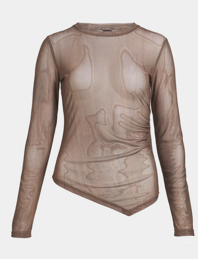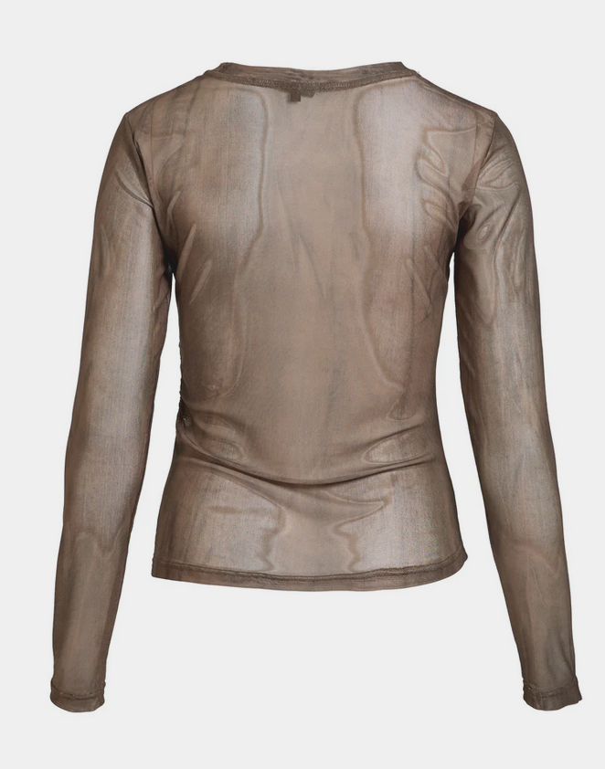 Die Agna Bluse von NU-Denmark ist ein einzigartiges Oberteil, das Eleganz und Stil vereint. Mit ihrem durchsichtigen, erdigen Braunton und dem kunstvollen Muster verleiht sie jedem Look Raffinesse. Die figurbetonte Passform betont die Silhouette auf subtile Weise, während das asymmetrische Design modische Akzente setzt.