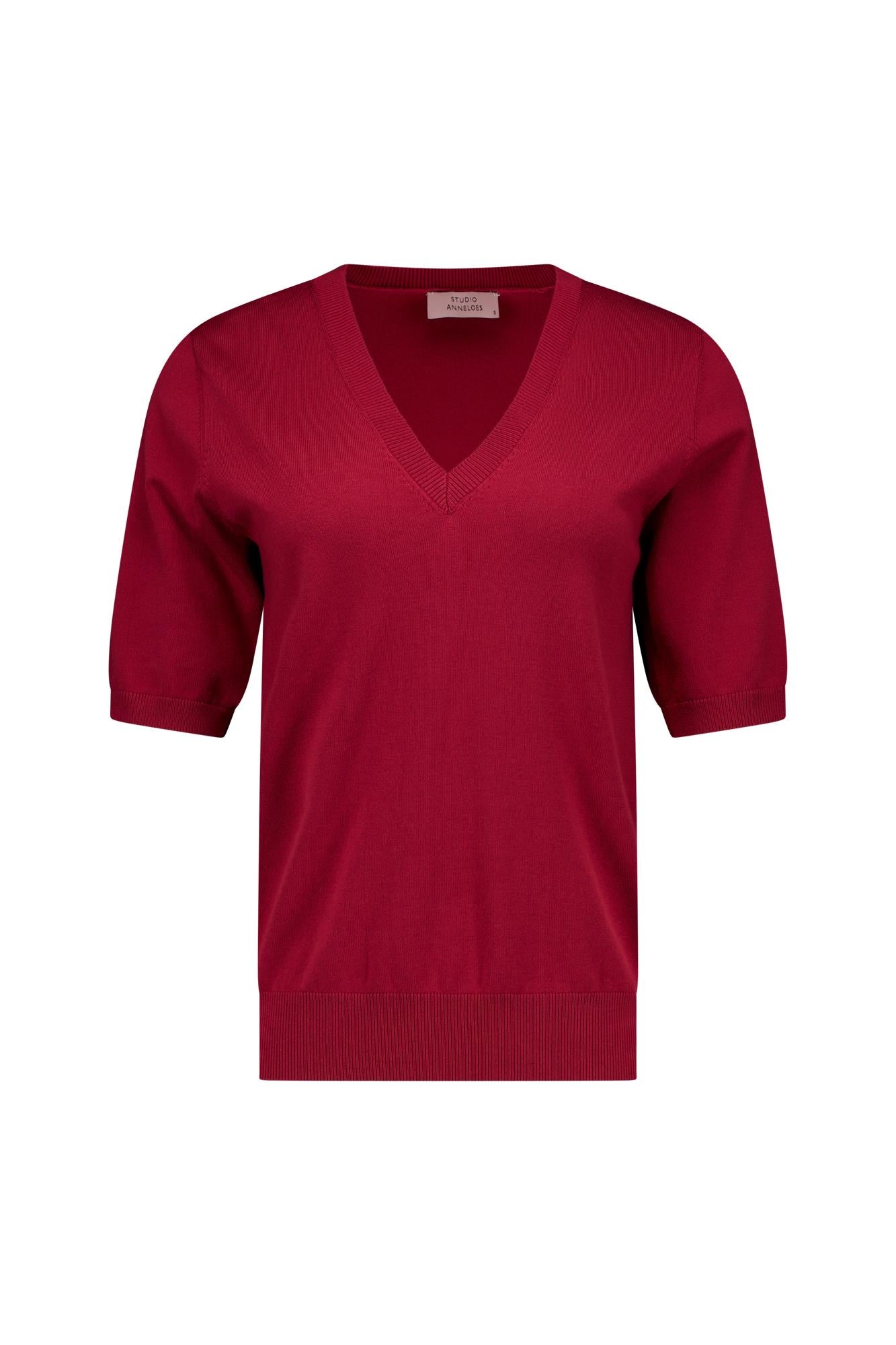 Meet the Truida Pullover, a charming addition to your wardrobe with its comfortable fit. This rich red sweater features a V-neck and short sleeves, perfect for both warm and cool days.