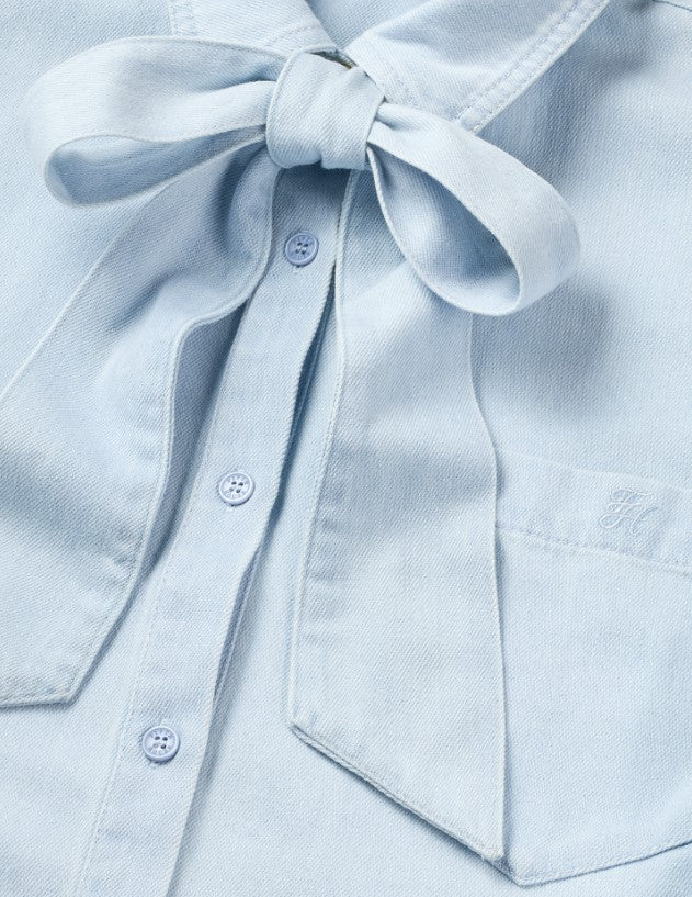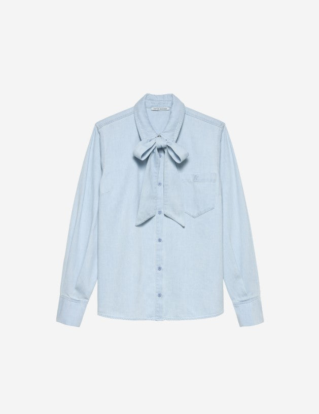 Mette Blouse by Fifth House offers a classic, tailored fit perfect for elevating any wardrobe. This elegant blouse features a crisp white color and a chic bow-tie collar that adds a touch of sophistication. The long sleeves and front pocket offer a timeless appeal, making it a versatile addition to your collection.