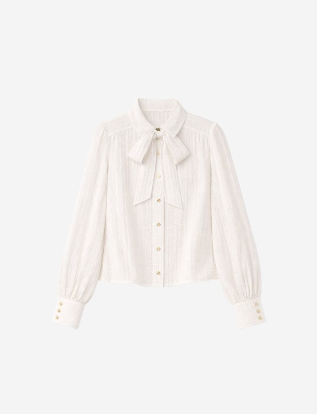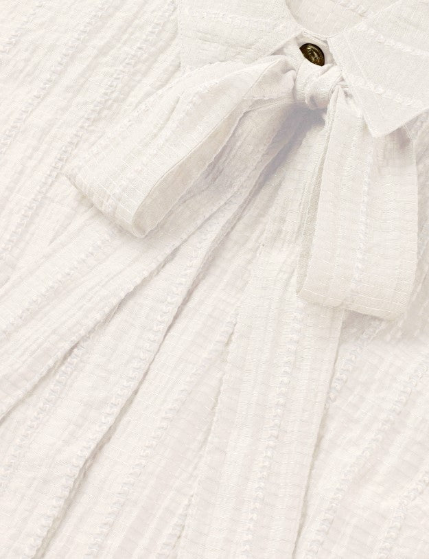 Myra Blouse by Fifth House offers refined elegance with its sleek design. This blouse highlights a classic fit and is adorned with a sophisticated scarf collar and cuffs, adding a touch of charm to your ensemble. The Myra Blouse comes in a timeless white color, perfect for any wardrobe.
