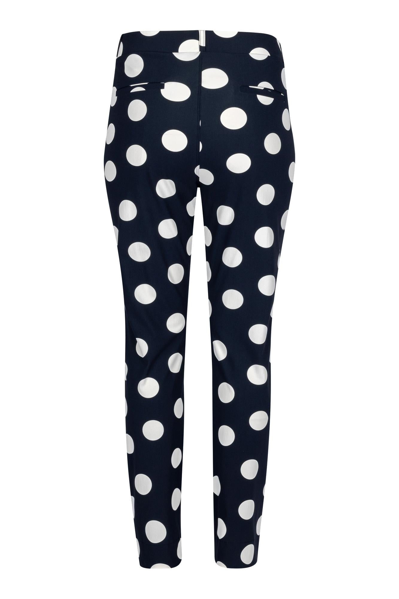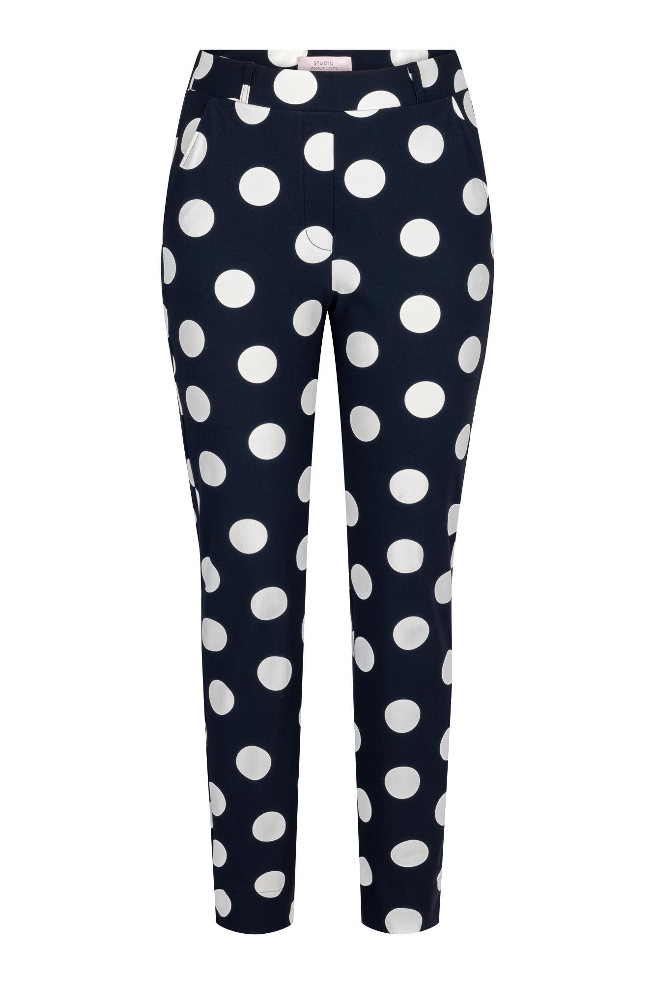 Anne polkadot trousers valt op door donkerblauw met grote witte polkadots. De broek heeft een slanke pasvorm met toelopende pijpen, riemlussen en steekzakken. De print maakt het kledingstuk vrolijk, de nette taille zorgt voor een gestroomlijnd silhouet.