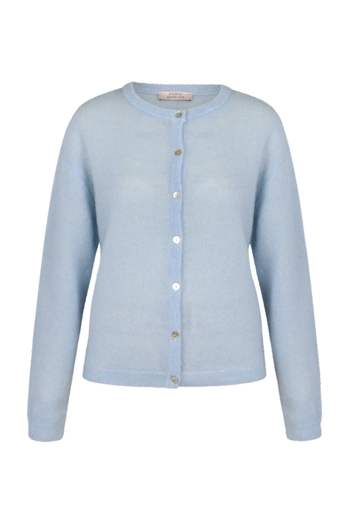 Bibi mohair cardigan van Studio Anneloes is een lichtblauwe cardigan met rechte pasvorm. Het kledingstuk voelt mohair-zacht, heeft een ronde hals, doorlopende knoopsluiting en ribboorden. Het effen breisel laat de subtiel glanzende knopen opvallen.