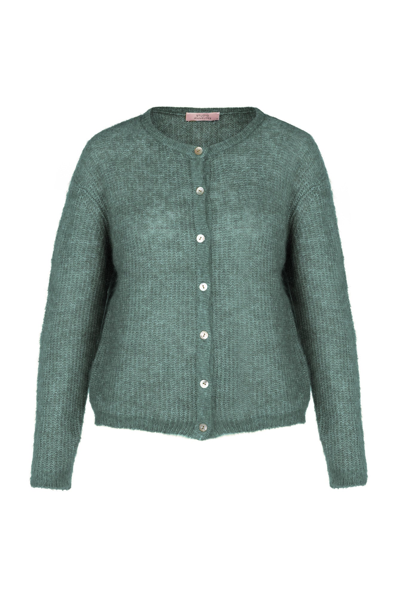 Bibi spring cardigan van Studio Anneloes is een zachtgroen vest met ronde hals en doorlopende knoopsluiting. Het luchtig gebreide kledingstuk voelt zacht, is effen en valt recht voor een comfortabele look. Subtiele ribboorden geven vorm zonder te knellen.