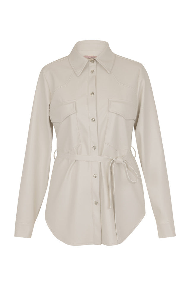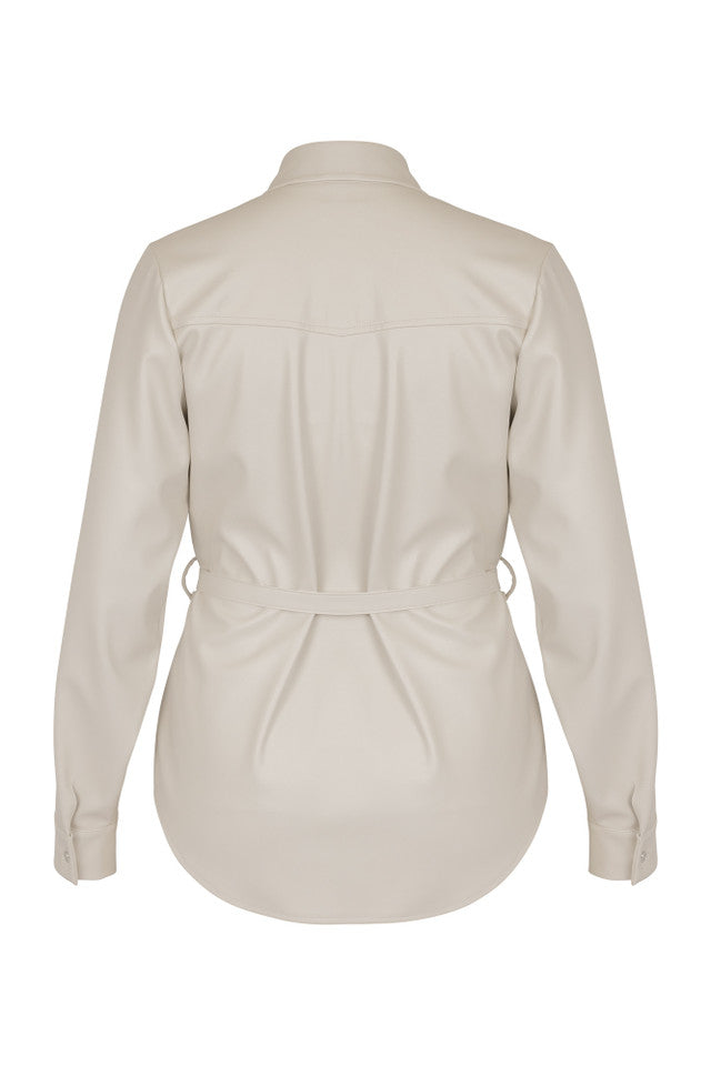 Bodil faux leather blouse van Studio Anneloes is een effen blouse in lichtbeige faux leather. Het kledingstuk heeft een klassieke kraag, doorknoopsluiting en lange mouwen. Twee borstzakken met klep geven een stoere touch. Dankzij het strikceintuur kun je de taille aanpassen; lusjes houden het op z’n plek. De afgeronde zoom en verfijnde stiksels zorgen voor een nette finish.