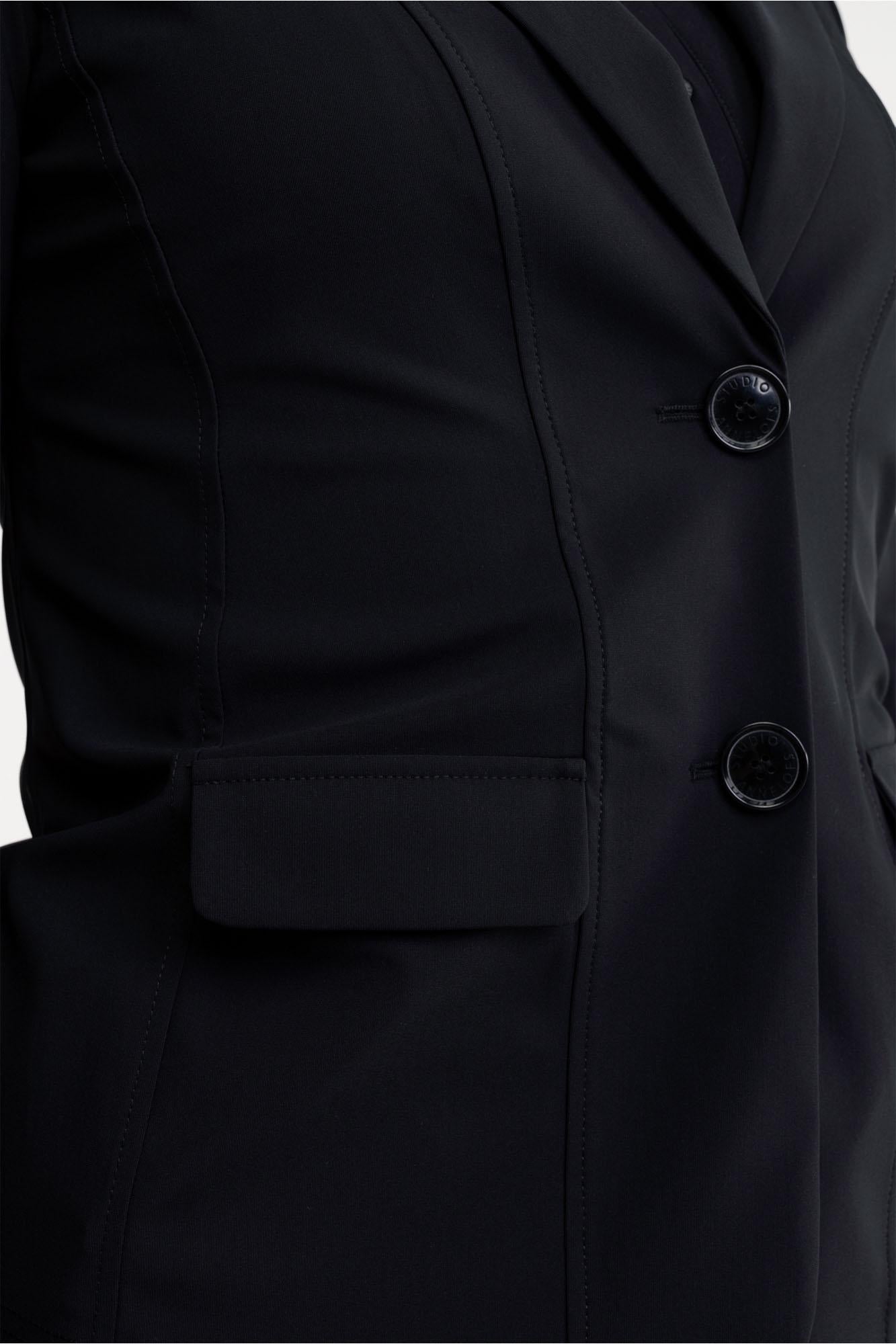 Bright bonded blazer van Studio Anneloes is een effen zwarte blazer met getailleerde pasvorm. De scherpe revers, twee grote knopen en klepzakken geven het kledingstuk een strakke, tijdloze uitstraling. Subtiele deelnaden benadrukken je taille, de lange mouwen en heuplengte maken ‘m makkelijk te combineren.