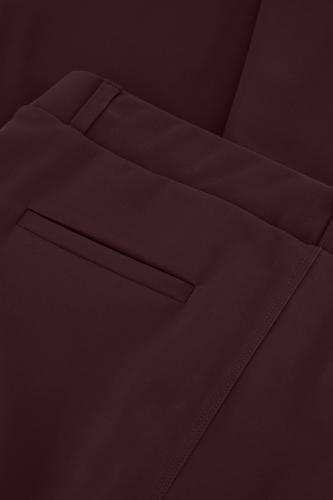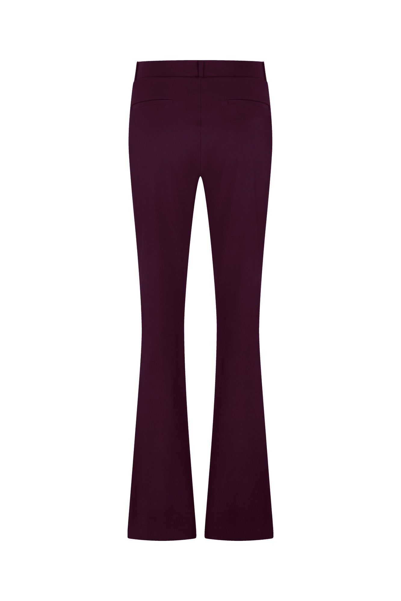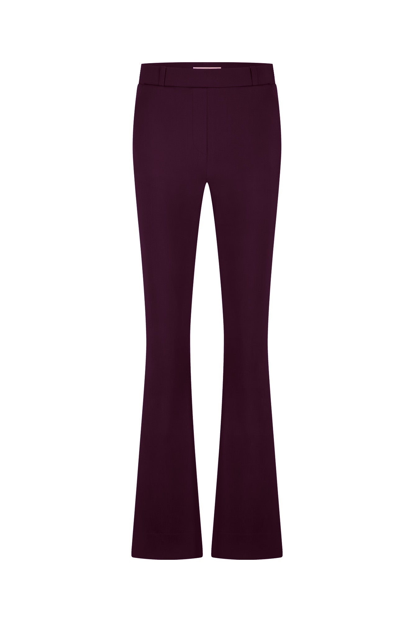Flair bonded trousers van Studio Anneloes is een broek met flared fit. De kleur is diep aubergine en het dessin is effen. De tailleband heeft riemlussen; de voorkant oogt clean. De pijp sluit aan tot aan de knie en loopt uit, zodat je benen langer lijken. Geen logoprint, gewoon tijdloos.