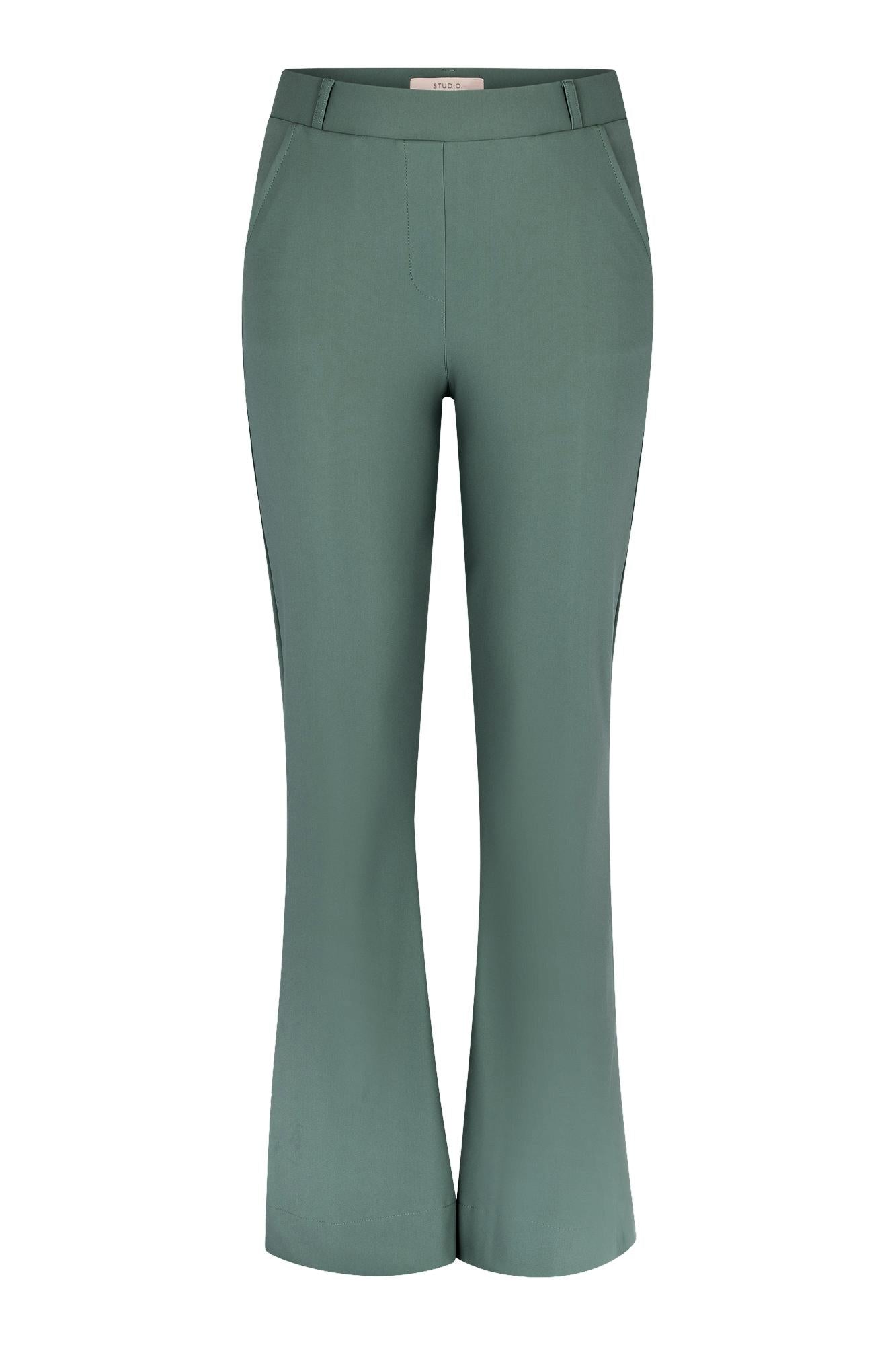 Flair bonded trousers van Studio Anneloes. Deze broek heeft een flared pasvorm met uitlopende pijpen, uitgevoerd in effen groen. De tailleband met riemlussen en de zijsteekzakken geven je een nette, comfortabele look. De cleane voorkant zonder opvallende sluiting houdt het strak en modern. Ideaal als veelzijdig kledingstuk voor dagelijks gebruik.