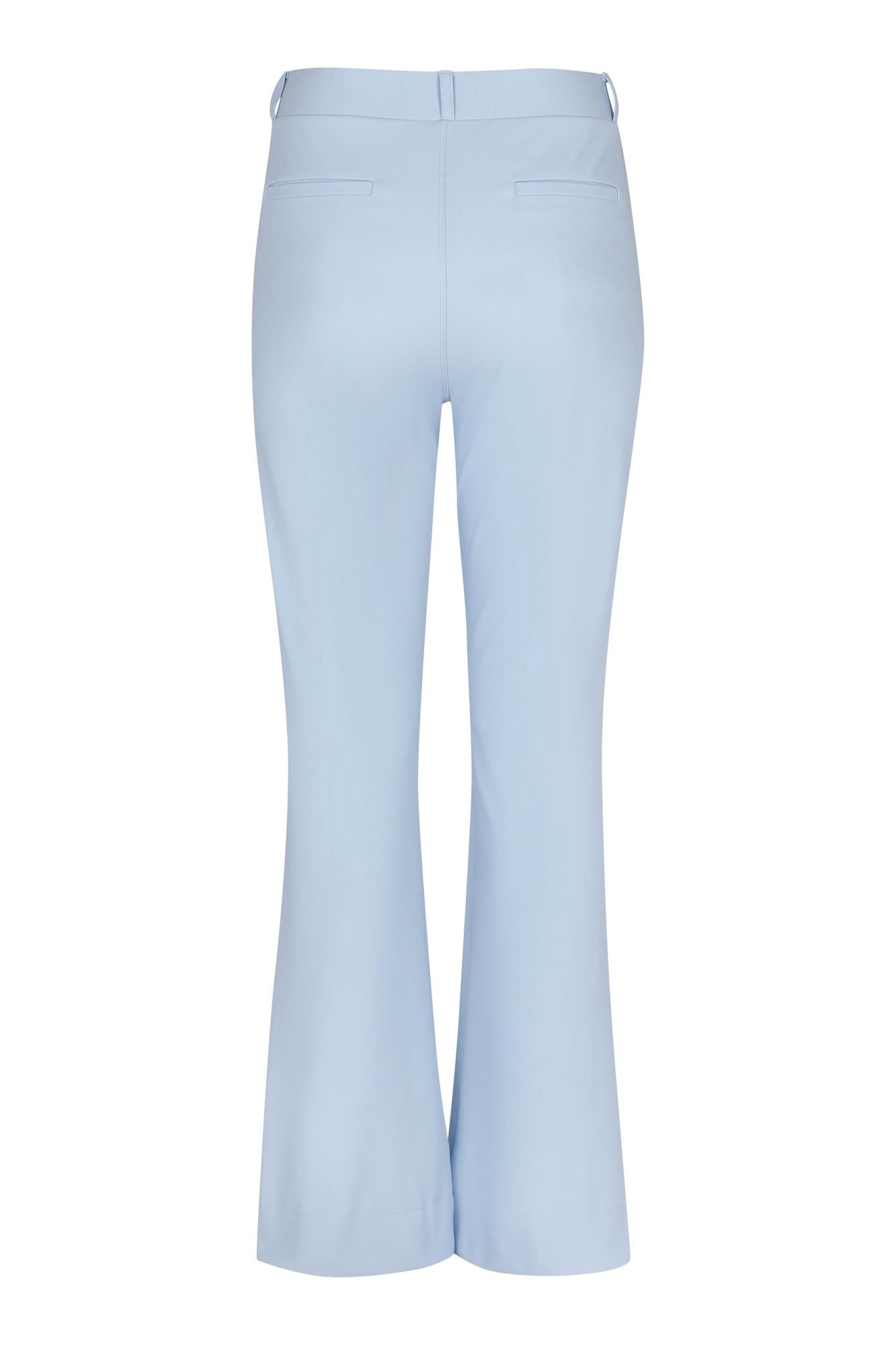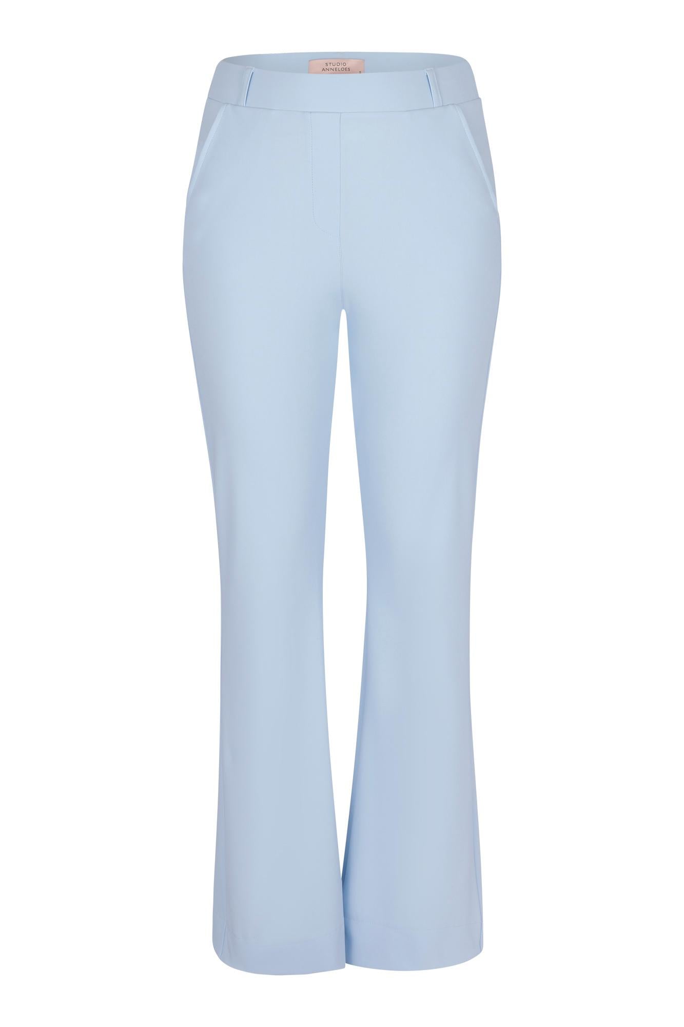 Flair bonded trousers van Studio Anneloes zet je stijl moeiteloos neer. Deze flared broek heeft een uitlopende pasvorm, een gladde tailleband met riemlussen en schuine steekzakken. De kleur is lichtblauw en het kledingstuk is effen, dus geen dessin of logoprint. De pijpen lopen elegant wijd uit voor een slanke lijn en fijne bewegingsvrijheid.