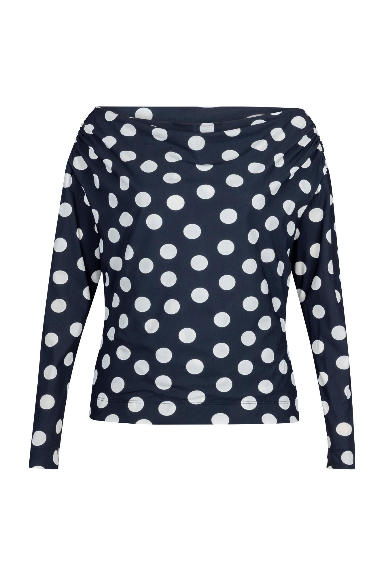Fleur polkadot top van Studio Anneloes. Deze top valt op door de donkerblauwe kleur met grote witte polkadots. Het kledingstuk heeft lange mouwen en een watervalhals die elegant valt. Als top draagt hij soepel en geeft je outfit meteen karakter.