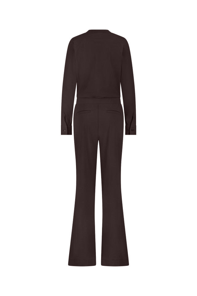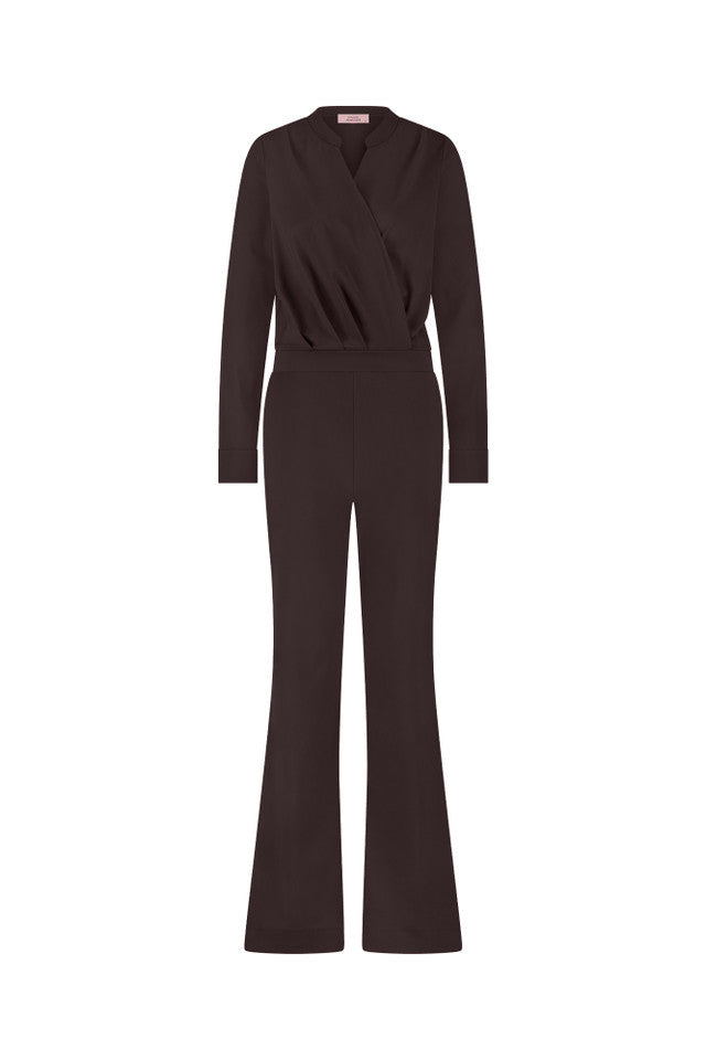 Grazia jumpsuit van Studio Anneloes brengt eenvoud en klasse samen. De donkerbruine jumpsuit heeft een overslag V-hals, lange mouwen en een brede tailleband die mooi aansluit. De pijpen lopen licht uit voor extra lengte. Het kledingstuk is effen, zonder dessin of logoprint. Grazia jumpsuit zit fijn en oogt verzorgd.