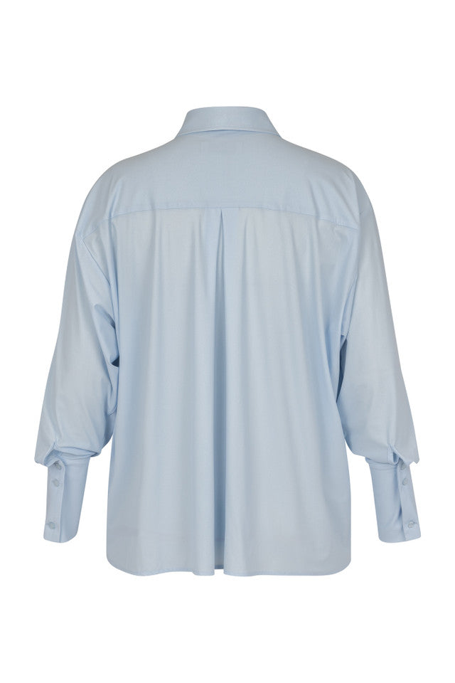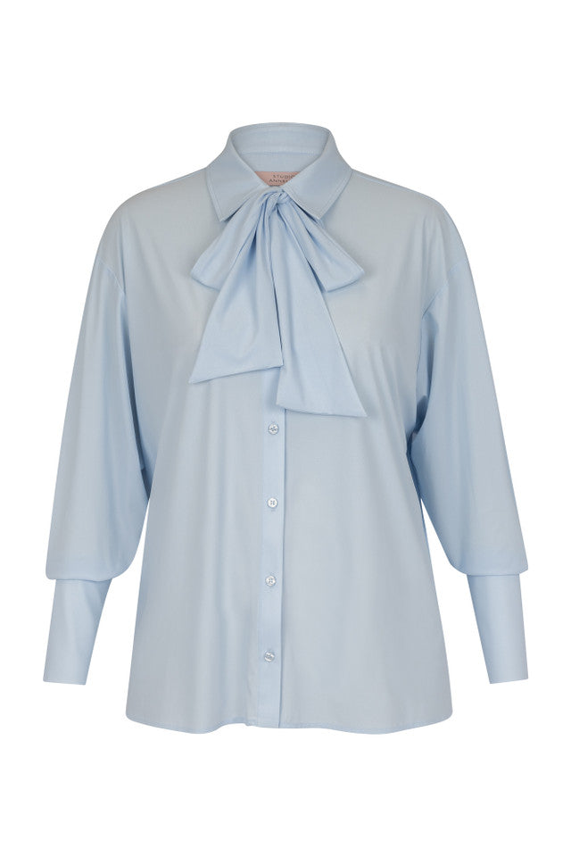 Hollis top van Studio Anneloes is een lichtblauw shirt met een losvallende pasvorm. Je oog valt op de grote strik bij de kraag en de doorknoopsluiting voor. De mouwen zijn ruim en eindigen in een lange, smalle manchet. Het kledingstuk is effen, zonder print, en oogt elegant maar relaxed.