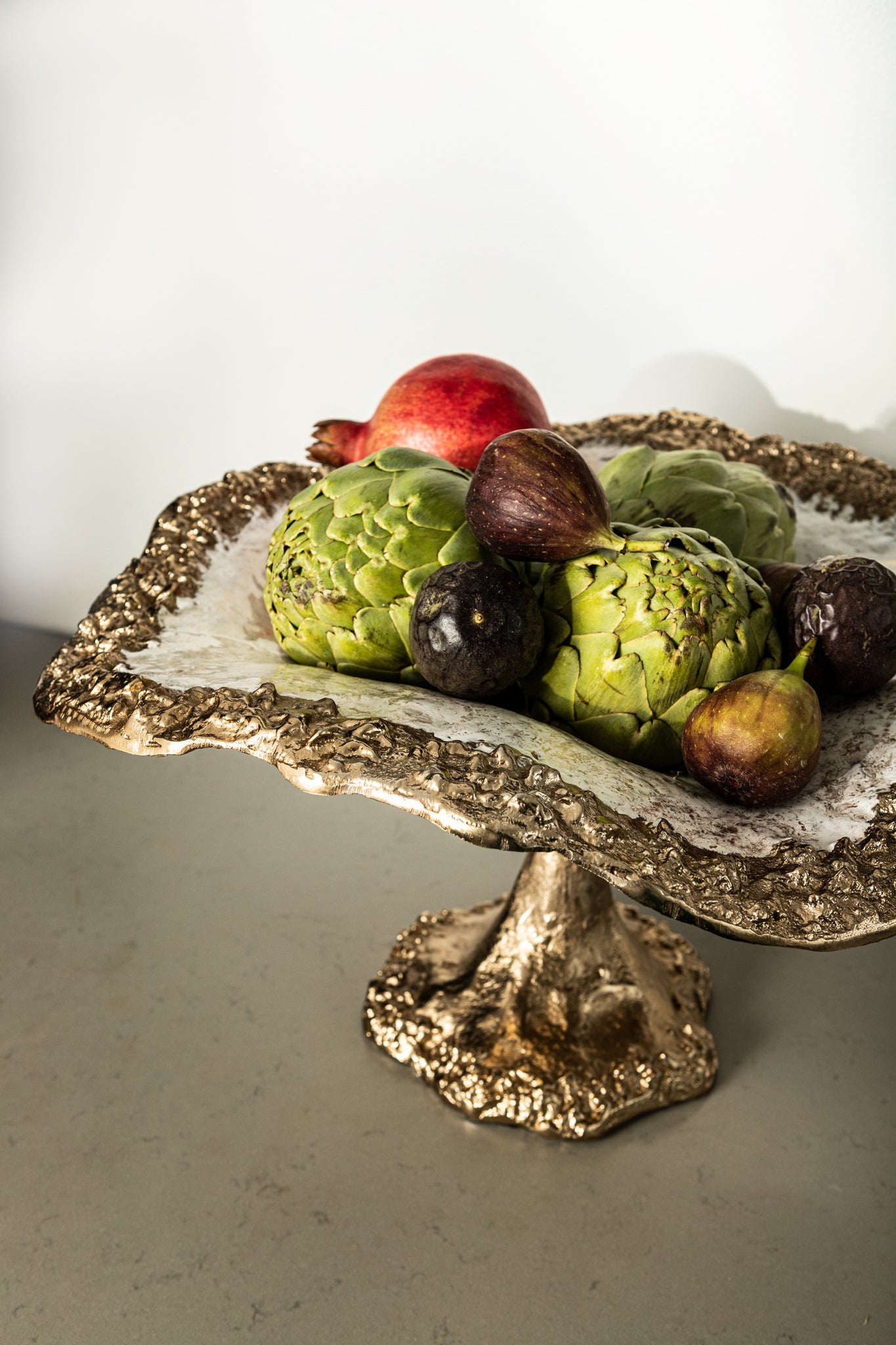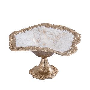 Liliane alu bowl on base cream enamel van Casa Bergen is een Living item dat meteen de aandacht pakt: goudkleurig aluminium met crème-witte enamel binnenzijde. De organische golfrand en ruwe textuur geven karakter; de voet tilt de schaal elegant op. Ideaal als centerpiece of voor kleine items.