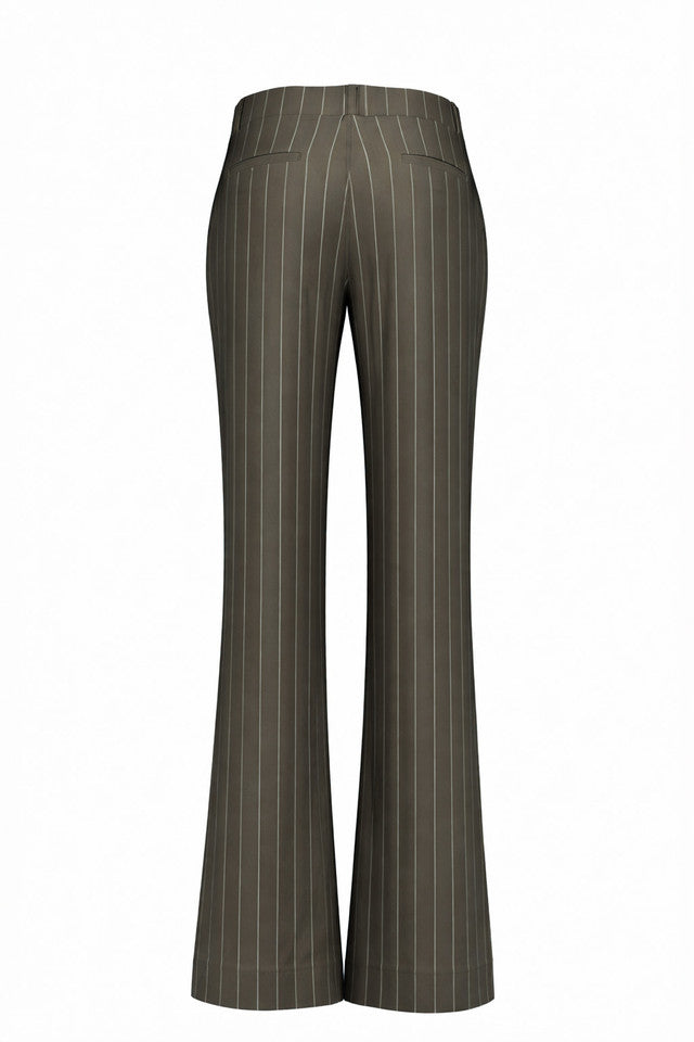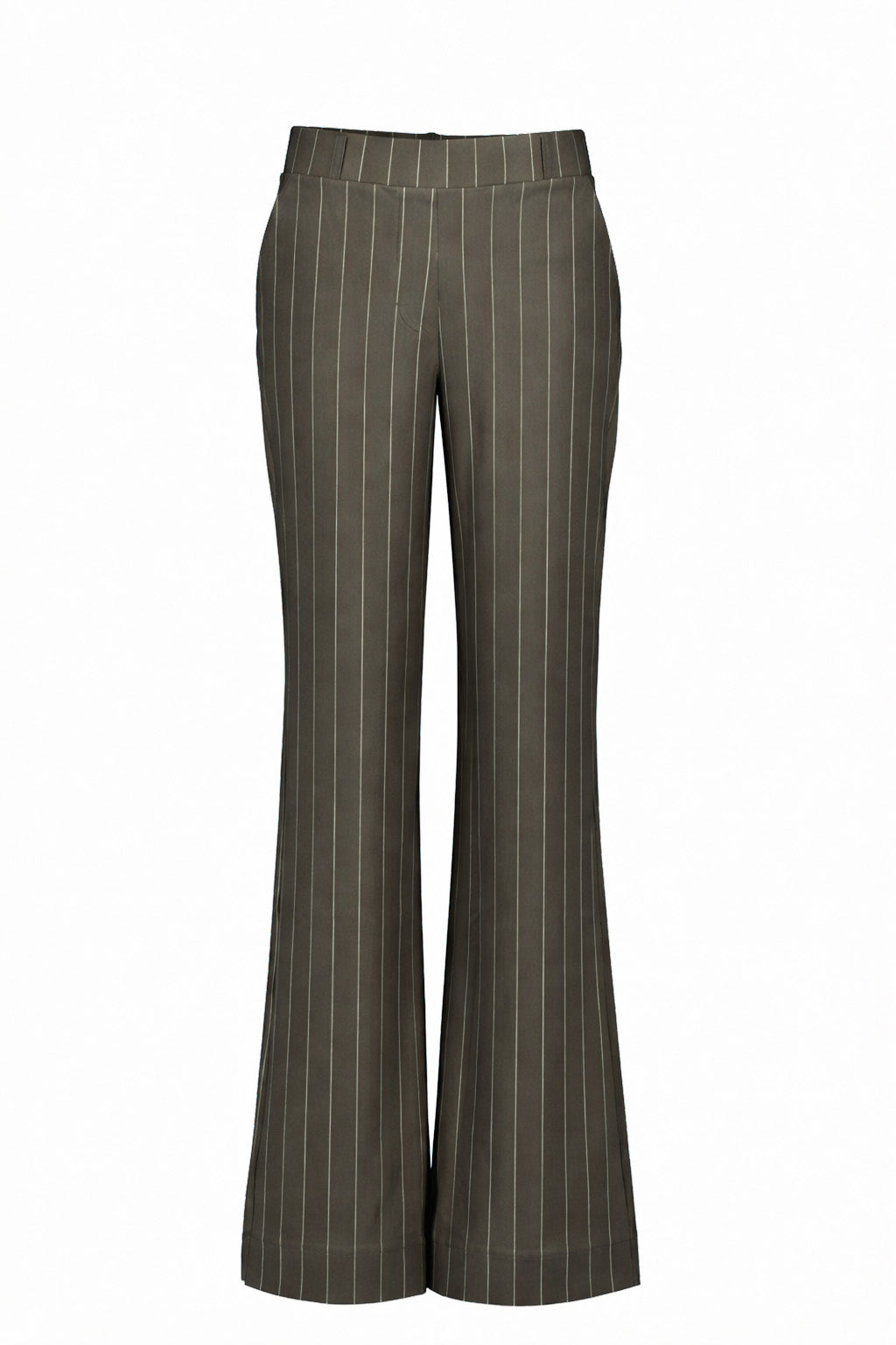 Marilon stripe trousers van Studio Anneloes trekt meteen de aandacht: olijfgroen met fijne verticale krijtstrepen en licht uitlopende pijpen. De pasvorm is slank langs heup en bovenbeen met een flared zoom. De taille zit comfortabel en het streepdessin laat je benen langer lijken. Dit kledingstuk combineer je makkelijk met een shirt.