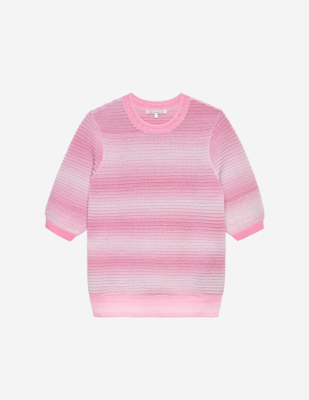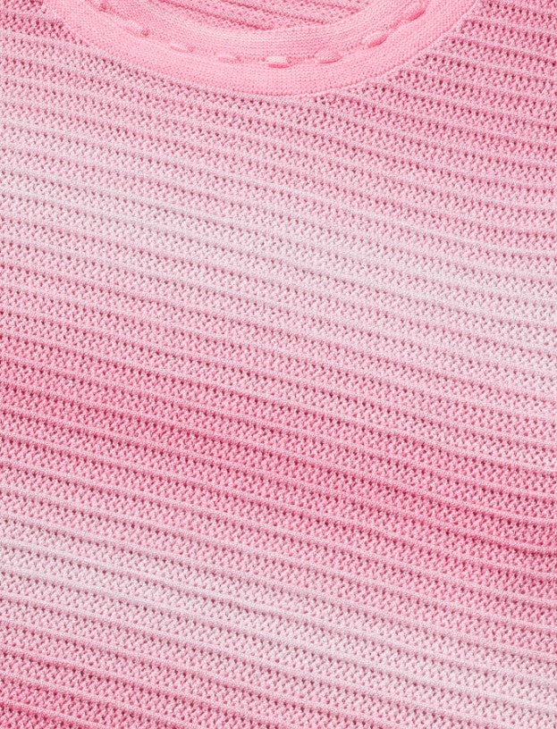 Marylou Top van Fifth House is een top met losvallende pasvorm, ronde hals en halflange mouwen. De kleur is roze met een subtiel ombre-effect naar lichtroze, in een fijngebreide, horizontale structuur. Zachte ribboorden langs hals en mouwzoom geven dit kledingstuk een nette finish.