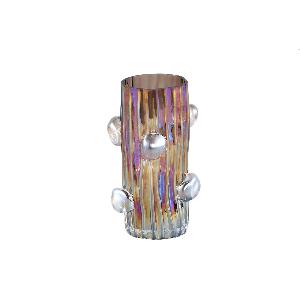 Parke solid glass vase with dots round van Casa Bergen is een Living vaas die meteen opvalt. De cilindervorm heeft een verticale ribbelstructuur en glanst iriserend in goud/brons met paarse en blauwe gloed. De ronde, parelheldere dots geven speels reliëf. Glanzende afwerking, gemaakt om op te vallen op tafel of dressoir.