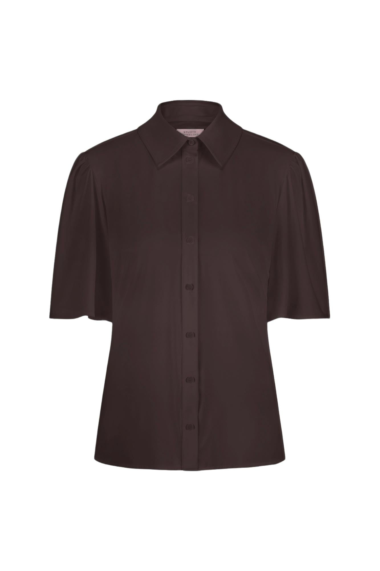 Poppy butterfly blouse van Studio Anneloes is een effen donkerbruine blouse met een losvallende pasvorm. De korte, zwierige vlindermouwen en klassieke kraag geven dit kledingstuk een luchtige look. Voorzijde met doorknoopsluiting; het model valt recht en oogt strak en clean.