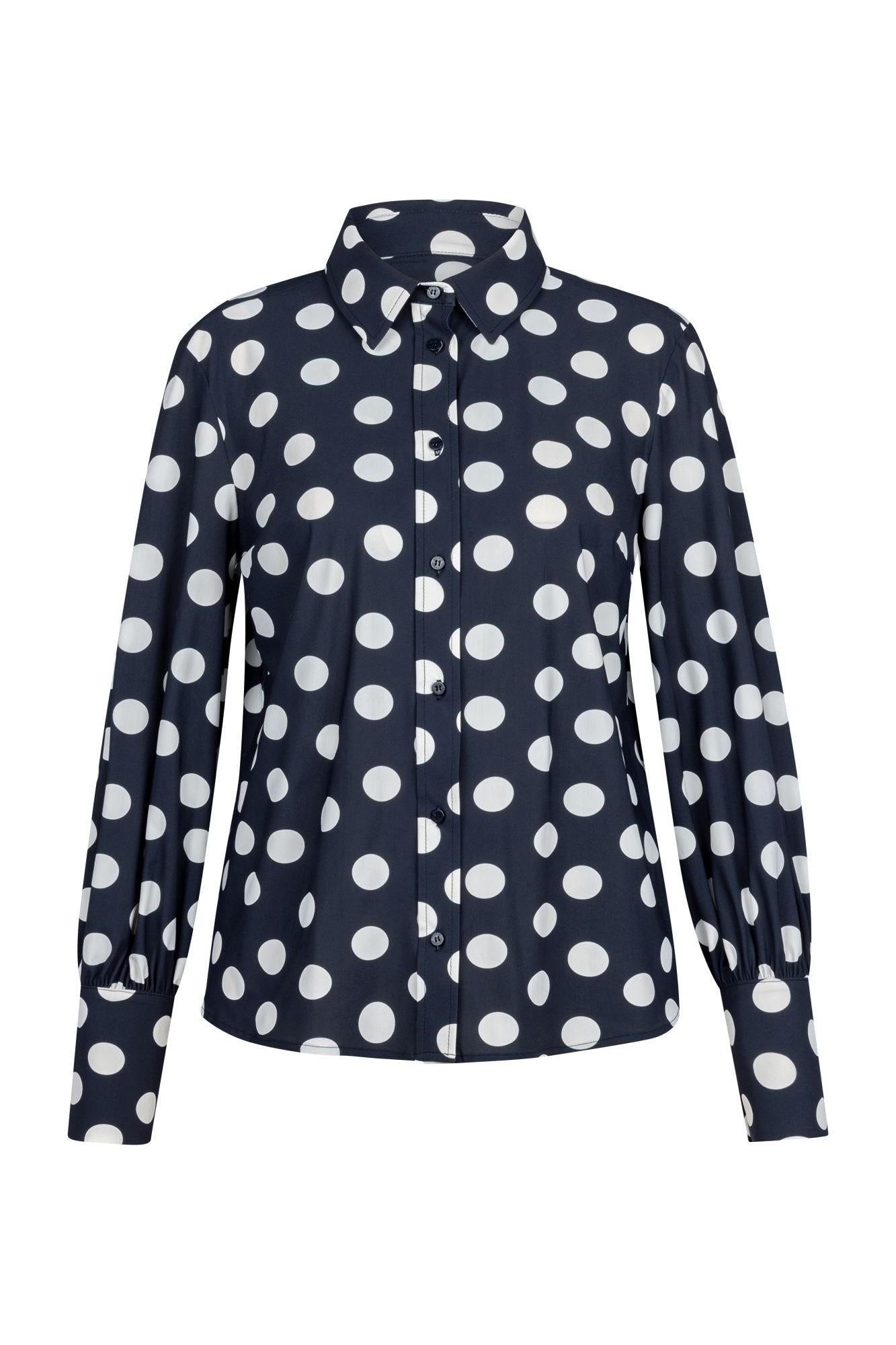 Rensje polkadot blouse van Studio Anneloes trekt de aandacht met het grote polkadot-dessin. De donkerblauwe blouse met witte stippen heeft een klassieke kraag, doorlopende knoopsluiting en lange mouwen met brede manchetten. De licht afgeronde zoom geeft het kledingstuk een nette, tijdloze uitstraling. Je combineert ’m moeiteloos.