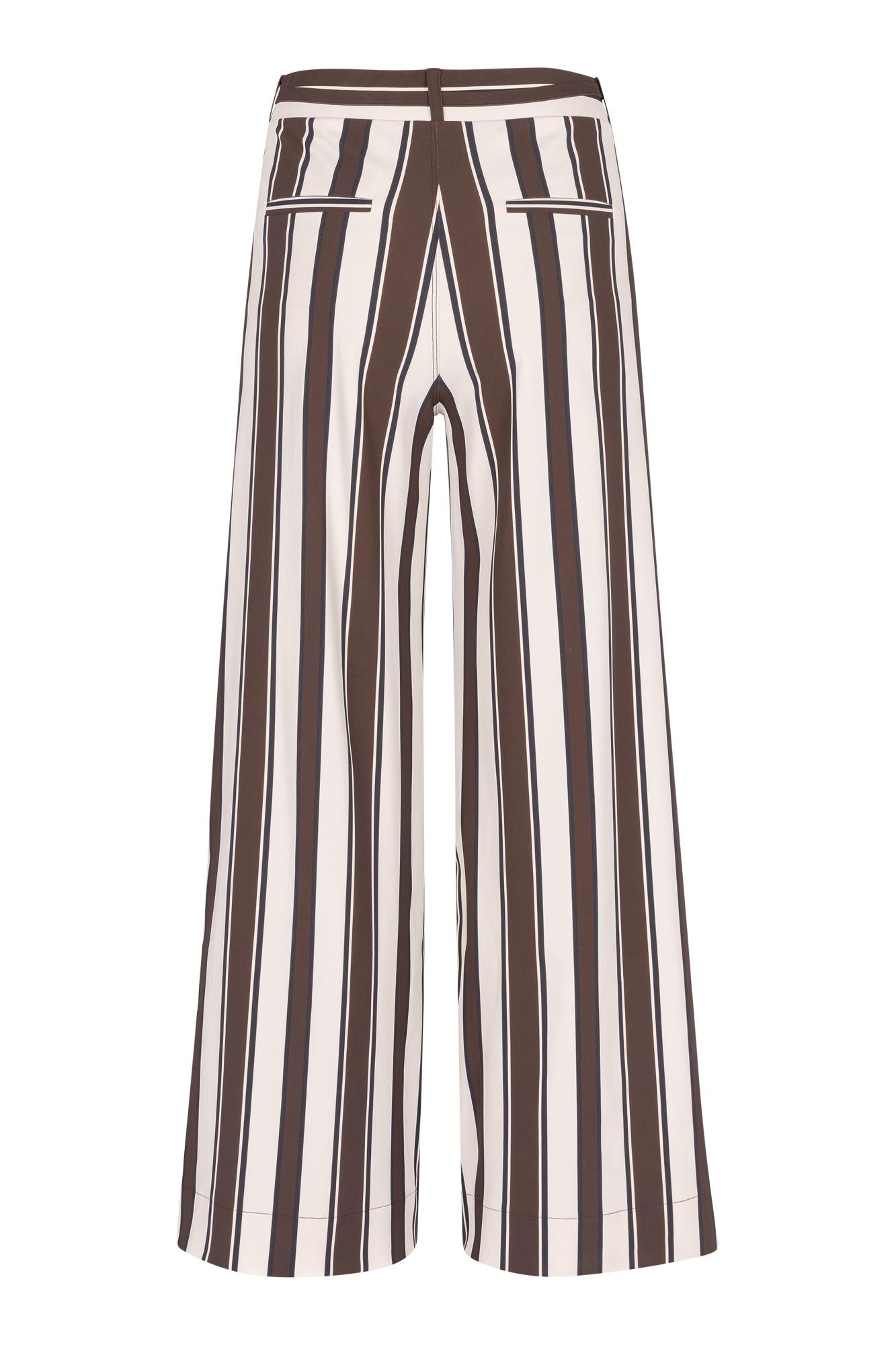 Sam stripe trousers van Studio Anneloes is een broek met wide-leg pasvorm en verticale strepen in bruin en wit met een donkere accentstreep. De taille heeft riemlussen en een strikceintuur, plus steekzakken. De wijde pijpen vallen losjes en lang.
